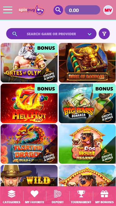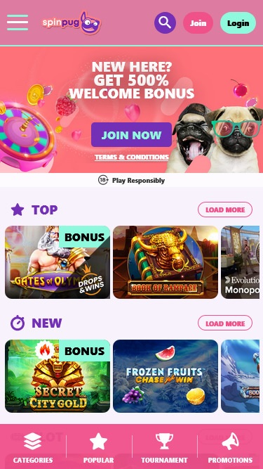 एक प्यारा सा पग एक ब्रांड शुभंकर है और यह पूरी तरह कार्यात्मक, अच्छी तरह से डिज़ाइन किए गए कैसीनो होमपेज के शीर्ष से आगंतुकों को मुस्कुराता और अभिवादन करता है।