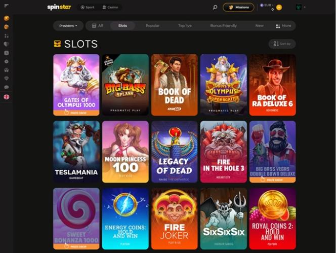 यहां कुछ उपलब्ध स्लॉट गेम दिए गए हैं जिन्हें आप स्पिनस्टार पर आज़मा सकते हैं: फायर इन द होल xBomb, डेड कैनरी, वांटेड डेड ऑर ए वाइल्ड, एल्विस फ्रॉग इन वेगास, टॉम्बस्टोन आरआईपी, एज़्टेक फायर, अग्लीएस्ट कैच, लीजन एक्स, स्पेस डोंकी, दास xबूट, पिग्गी पॉप, वाइल्ड बफैलो होल्ड 'एन' लिंक, बुक ऑफ डेमी गॉड्स II, बुक ऑफ रैम्पेज, 90k यति गिगाब्लॉक्स, एविल गोब्लिन्स xBomb, कैश क्वेस्ट, वुल्फ फैंग - आयरन वुल्फ, और अधिक।