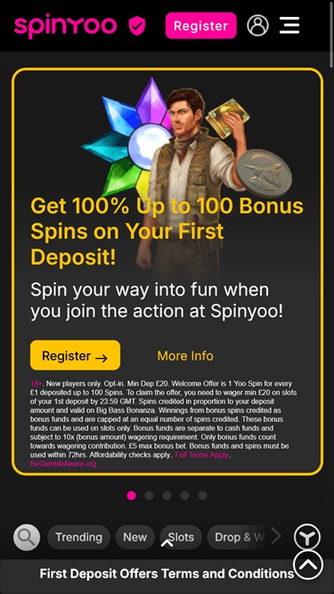 स्पिनयू ने सभी नए पंजीकृत खिलाड़ियों के लिए एक शानदार स्वागत प्रस्ताव रखा है जो जमा राशि जमा करने वाले हैं। इसमें तीन जमा मैच ऑफर शामिल हैं; पहले ऑफर में अतिरिक्त स्पिन शामिल हैं।
