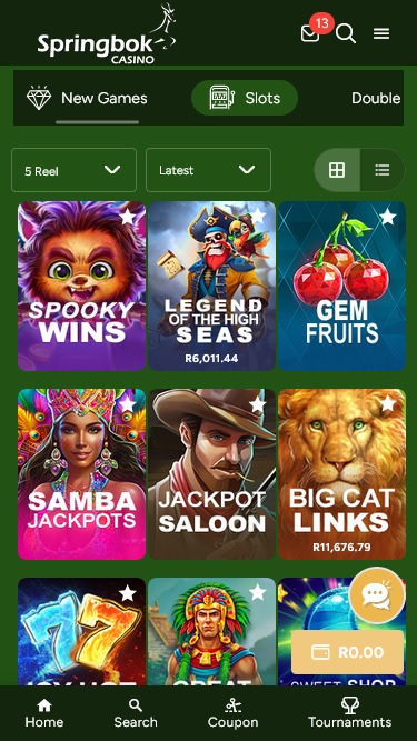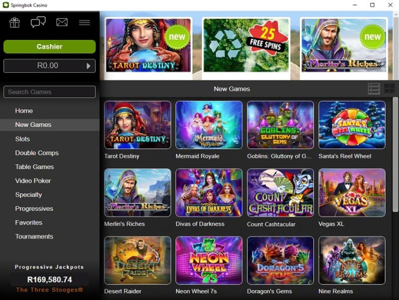 स्प्रिंगबॉक कैसीनो में खेलने के लिए अच्छी संख्या में स्लॉट उपलब्ध हैं, जिनमें वीडियो और क्लासिक दोनों तरह के गेम शामिल हैं। ये गेम लगभग पूरी तरह से अनोखे हैं, लेकिन खिलाड़ी नए थ्री स्टूज स्लॉट पर भी रीलों को घुमा सकेंगे। कई प्रोग्रेसिव जैकपॉट जीते जा सकते हैं, जो किसी भी समय बड़े नकद पुरस्कार दे सकते हैं। कुछ गेम मोबाइल प्ले सपोर्टेड भी हैं, जिससे आप अपने स्मार्टफोन या टैबलेट के ज़रिए खेल सकते हैं।