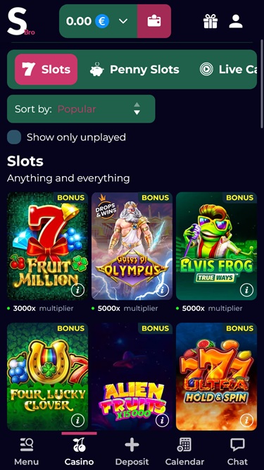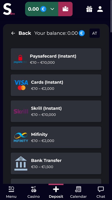 ऊपरी दाएँ कोने में चैट, सूचनाएँ, प्रोफ़ाइल सेटिंग्स, खोज और एक मेनू है जहाँ आपको न केवल आपका वर्तमान बैलेंस और बोनस बैलेंस मिलेगा, बल्कि आपके वीआईपी पॉइंट्स और वीआईपी लेवल भी मिलेंगे।