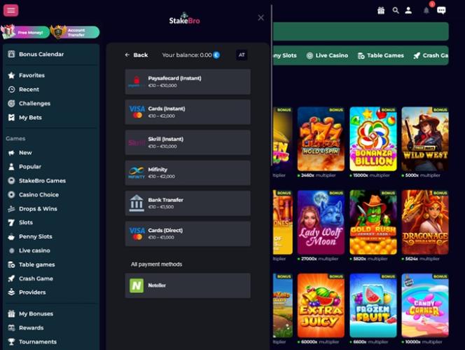 बाईं ओर के मेनू में फ्री मनी, अकाउंट ट्रांसफर, बोनस कैलेंडर, पसंदीदा, हाल के, चुनौतियाँ, मेरे दांव, ईस्टर स्पेशल, नए, लोकप्रिय, स्टेकब्रो गेम्स, कैसीनो विकल्प, ड्रॉप्स और विन्स, स्लॉट, पेनी स्लॉट, लाइव कैसीनो, टेबल गेम्स, क्रैश गेम्स, प्रोवाइडर्स, मेरे बोनस, रिवॉर्ड्स, टूर्नामेंट, किसी दोस्त को रेफर करें, भाषा विकल्प, लाइव चैट और लॉगआउट जैसे कई बटन मौजूद हैं।