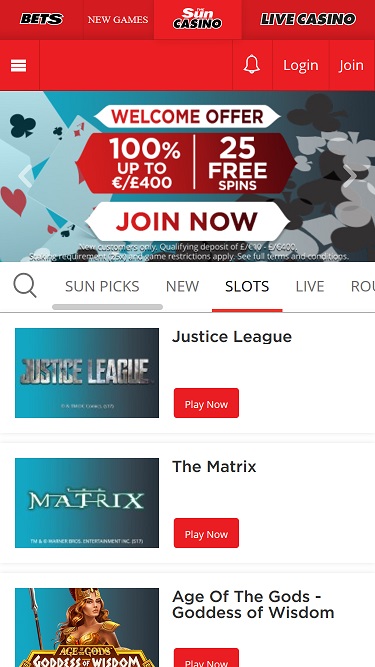 सन बेट्स पर क्लासिक और वीडियो स्लॉट्स की एक बड़ी संख्या उपलब्ध है, क्योंकि डेवलपर प्लेटेक के सभी गेम, जिनमें लाइसेंस प्राप्त और अनोखे दोनों प्रकार के गेम शामिल हैं, प्रदान करता है। इसके अलावा, कई प्रोग्रेसिव जैकपॉट भी उपलब्ध हैं, जो खिलाड़ियों को ग्लेडिएटर, स्वीट पार्टी और एवरीबडीज़ जैकपॉट जैसे बड़े इनाम जीतने का मौका देते हैं। मोबाइल स्लॉट भी उपलब्ध हैं, इसलिए आप अपने स्मार्टफोन के ज़रिए चलते-फिरते खेल सकते हैं।
