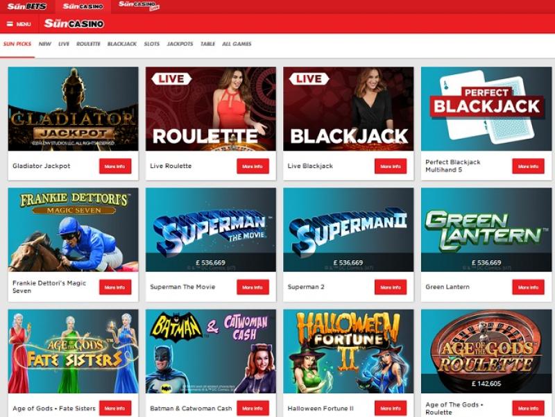 मानक कैसीनो खेलों के अलावा, सन बेट्स अपने ग्राहकों को एक पूर्ण स्पोर्ट्सबुक और लाइव डीलर कैसीनो भी प्रदान करता है, जिसमें टेबल गेम्स की एक श्रृंखला एकीकृत होती है।