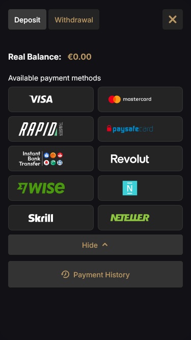 स्क्रीन के बाएँ भाग पर माउस ले जाने से एक मेनू खुलेगा जो आपको कैसीनो की लॉबी, पसंदीदा गेम, हाल ही में खेले गए गेम, खोज, स्लॉट गेम, नए गेम, लाइव गेम, साथ ही बोनस और सहायता अनुभागों तक ले जाएगा। वेबसाइट के जिस भी भाग पर आप जाना चाहते हैं, वह बस एक क्लिक दूर है।