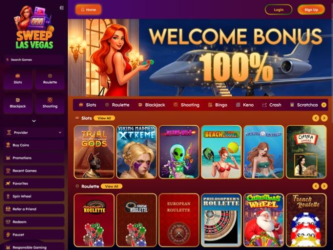 2025 में लॉन्च होने वाला, स्वीपलासवेगास एक सोशल कैसीनो है जो ऑनलाइन स्लॉट, लाइव डीलर, टेबल गेम, क्रैश गेम और कई अन्य विशेष रिलीज़ जैसे कैसीनो-शैली के खेलों की एक विस्तृत श्रृंखला के साथ संयुक्त राज्य अमेरिका के खिलाड़ियों का स्वागत करता है। इस ब्रांड में कई बोनस और प्रमोशन के साथ एक पुरस्कृत प्रचार योजना भी शामिल है।