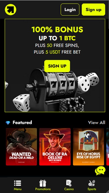 New Customer Offer. T&C’s Apply. 18+.This offer is not available for players residing in Ontario. New Customer Offer. T&C’s Apply. 19+. Play Responsibly. PLUS 50 Free Spins + 5 USDT Sports Free Bet. The bonus is paid in 10 installments with a maximum of 1 BTC. Minimum deposit: 20 USDT. Every time you wager your initial deposit 6 times 10% of the initial deposit is credited as cash.