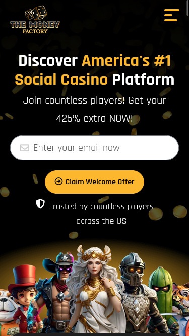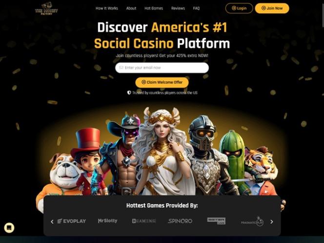 द मनी फ़ैक्टरी एक सोशल कैसीनो है जो इडाहो, लुइसियाना, मिशिगन, मोंटाना, नेवादा, वाशिंगटन और अमेरिका के किसी भी बाहरी क्षेत्र को छोड़कर, संयुक्त राज्य अमेरिका के खिलाड़ियों का स्वागत करता है। वेबसाइट पर प्रवेश करते ही, खिलाड़ी तुरंत महसूस करेंगे कि इस सोशल कैसीनो को डिज़ाइन करने में कितनी सावधानी और ध्यान दिया गया है। मुख्य रंग पैलेट में गहरे रंग की पृष्ठभूमि और सुनहरे रंग के शेड्स हैं, जो एक शानदार दिखने वाली साइट बनाते हैं जो सुंदर होने के साथ-साथ समझने और नेविगेट करने में भी आसान है। खिलाड़ियों को यूज़र इंटरफ़ेस में कोई समस्या नहीं होगी, क्योंकि सभी गेम और सेक्शन ब्राउज़ करना आसान बना दिया गया है।