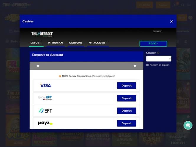 थंडरबोल्ट कैसीनो Real Time Gaming and Spinlogic Gaming द्वारा संचालित है, और इसके गेम्स को वेब-आधारित प्लेटफ़ॉर्म या डाउनलोड करने योग्य कैसीनो क्लाइंट के माध्यम से एक्सेस किया जा सकता है। टैबलेट या स्मार्टफ़ोन पर गेम खेलने के इच्छुक लोगों के लिए एक मोबाइल साइट भी उपलब्ध है।