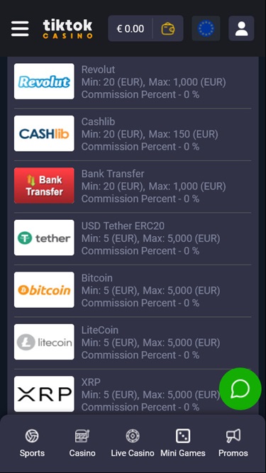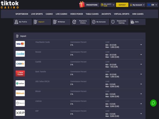 भुगतान विधि की सुगमता एक और महत्वपूर्ण कारक है जिस पर टिकटॉक कैसीनो ने कड़ी मेहनत की है। खिलाड़ी अपने कैसीनो बैलेंस को प्रबंधित करने के लिए कई बैंकिंग विकल्पों में से चुन सकते हैं। पारंपरिक तरीकों में वीज़ा , मास्टरकार्ड , बैंक वायर ट्रांसफर , जेटॉन , माइफिनिटी , ईज़ी वॉलेट और अन्य शामिल हैं, जबकि आधुनिक विकल्पों में बिटकॉइन , एथेरियम , लाइटकॉइन , टीथर और रिपल जैसी क्रिप्टोकरेंसी शामिल हैं।