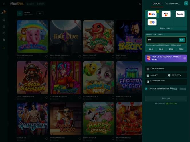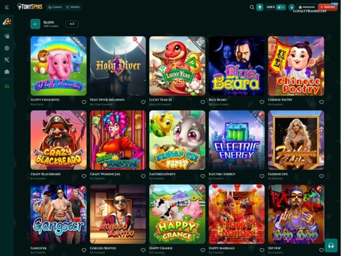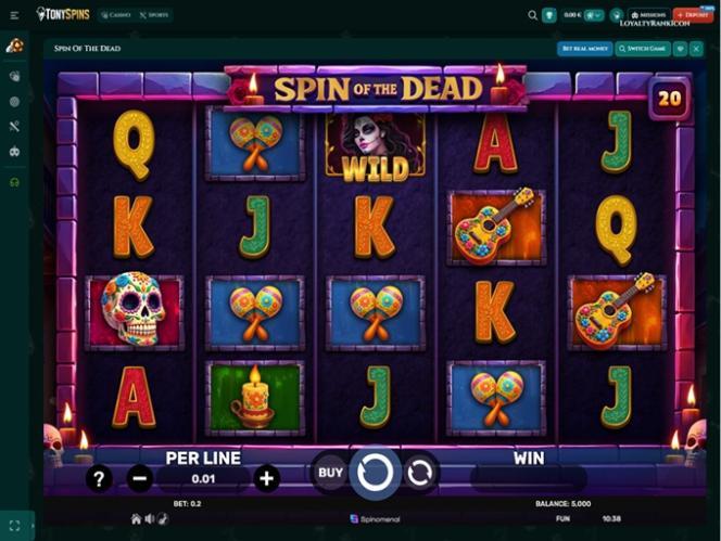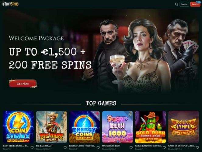 टोनीस्पिन्स कैसीनो एक ऑनलाइन गेमिंग साइट है जो "अंडरवर्ल्ड" और डकैत प्रतीकवाद के विषयों से काफी प्रेरित है, इसलिए अधिकतर आपको "परिवार में आपका स्वागत है" या "लुका का उपहार" शीर्षक वाले बोनस के साथ-साथ पृष्ठभूमि में घूमते हुए कई संदिग्ध चरित्र भी दिखाई देंगे।