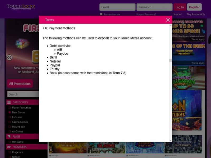 टच लकी कैसीनो वर्तमान में अपने ग्राहकों को कॉम्प पॉइंट्स प्रदान नहीं करता है।