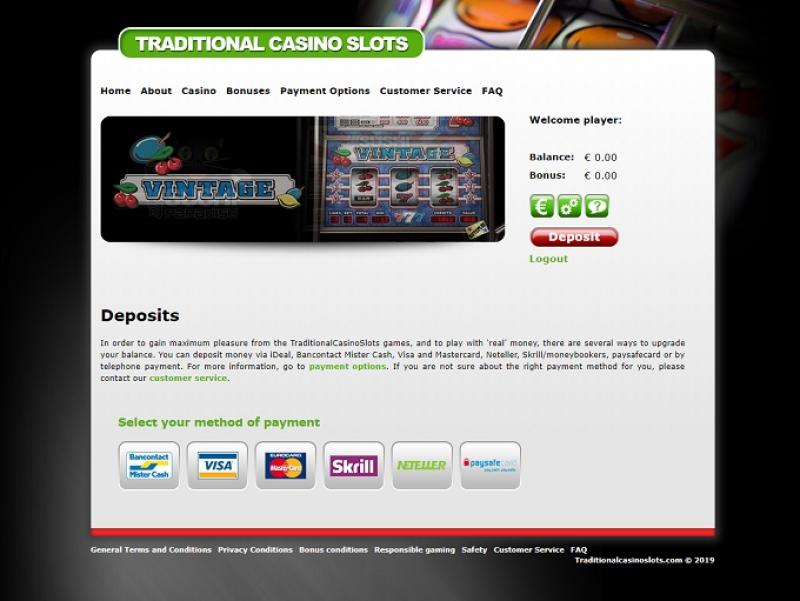 ट्रेडिशनल कैसीनो स्लॉट्स एक ऑनलाइन सट्टेबाजी साइट है जिसने 2013 में अपनी शुरुआत की थी और इसका स्वामित्व और संचालन यूरोप के रीलोड एनवी द्वारा किया जाता है। यह कैसीनो दिखने में बहुत ही साधारण है, और वर्तमान में यह अपने ग्राहकों को केवल क्लासिक शैली के स्लॉट ही प्रदान करता है। इसके बावजूद, बैंकिंग समय के मामले में यह साइट अच्छी है, और इसलिए अगर आप केवल पुरानी शैली की स्लॉट मशीनों के शौकीन हैं तो यह एक अच्छी जगह है।कैसीनो जानकारी