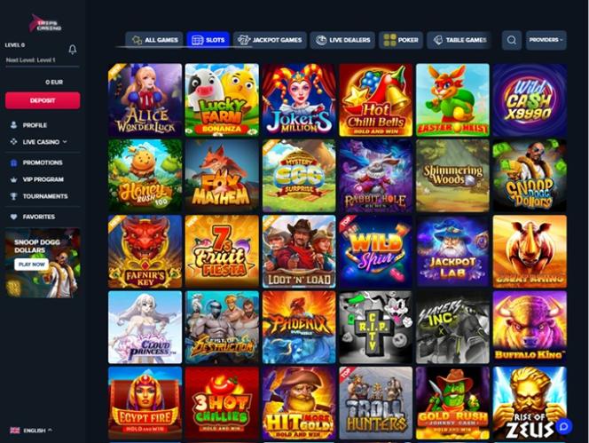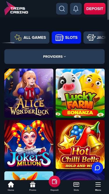 ट्रिप्स कैसीनो में ऑनलाइन स्लॉट गेम के शौकीनों के लिए लगभग चार हज़ार उपलब्ध टाइटल्स मौजूद हैं। अगर आप भी उनमें से एक हैं, तो आराम से बैठिए और कुछ चुनिंदा स्लॉट हिट्स पर एक नज़र डालिए, जैसे 100 हॉट स्लॉट, 1001 स्पिन्स, 2 मिलियन बीसी, अफ्रीका गोल्ड 2, अफ्रीकन स्पिरिट स्टिकी वाइल्ड्स, अल्केमी गोल्ड, एलिस वंडरलक, अमेज़न सिटी ऑफ़ गोल्ड, एंशिएंट टेम्पल जेम्स, एरो स्लॉट, एज़्टेक फ़ायर होल्ड एंड विन, बैम्बू ग्रोव, बैम्बू रश, बेकरी बोनान्ज़ा, बिग कैच होल्ड एंड विन, बिकिनी पैराडाइज़, बुक ऑफ़ ओलिंपस, इजिप्ट फ़ायर, फ़ॉर्च्यून बेल्स, फ़ॉर्च्यून रैबिट, हिट द गोल्ड होल्ड एंड विन, हॉट चिली बेल्स होल्ड एंड विन, जैकपॉट लैब, किंग ऑफ़ सांबा, लकी फ़ार्म बोनान्ज़ा, राइज़ ऑफ़ ज़ीउस, स्नूप डॉग डॉलर्स, स्ट्रीट निंजा, स्वीट कैंडीज़ एंड फ्रूट्स, वाइल्ड स्पिन, और भी बहुत कुछ।