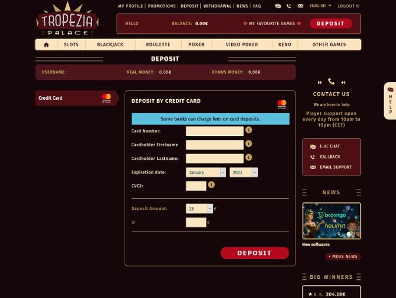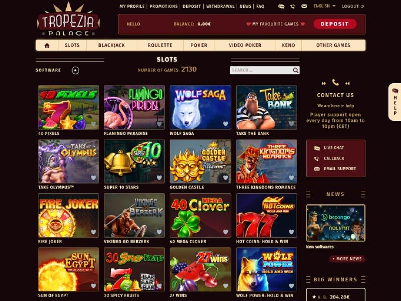 Tropezia Palace Net Entertainment, Playtech, BetSoft, Amatic Industries, Big Time Gaming, ELK Studios, Evolution Gaming, EYECON, Play'n GO, playson, Quickspin, Relax Gaming, Yggdrasil, Wazdan, Booming Games, Stakelogic, Pragmatic Play, Nolimit City, Red Tiger Gaming, Booongo, Spinomenal, Felix Gaming, Red Rake Gaming, Fugaso, Fantasma Games, Kalamba, Skywind, Pocket Games Soft, Bulletproof Games, Gluck Games, TrueLab Games, Amusnet Interactive, Ash Gaming, Push Gaming, Noble Gaming, Reflex Gaming, Wild Streak Gaming, Jade Rabbit Gaming, RubyPlay, 4ThePlayer, AvatarUX, Gamevy, High 5 Games, ReelPlay, Rarestone Gaming, BB Games, Boomerang Studios, Hacksaw Gaming, Max Win Gaming, Bang Bang Games and Peter And Sons द्वारा संचालित है, जो अपने वेब-आधारित प्लेटफ़ॉर्म के माध्यम से सट्टेबाज़ों को सैकड़ों गेम प्रदान करता है। कैसीनो के लिए पंजीकरण प्रक्रिया तेज़ और कुशल है, इसमें आपका केवल कुछ मिनट का समय लगता है, और साइट पर नेविगेशन भी आसान है। किसी विशिष्ट गेम की तलाश करने वाले खिलाड़ी सर्च फ़ंक्शन का उपयोग कर सकते हैं, जो टेबल गेम या स्लॉट खोजने में कारगर साबित हुआ।Blackjack