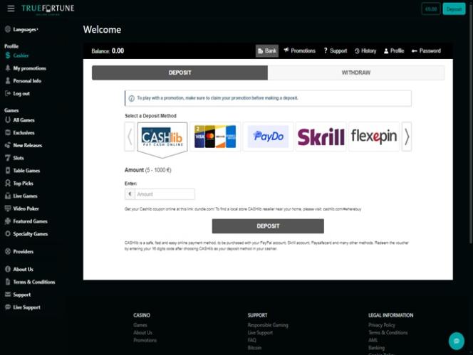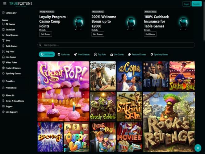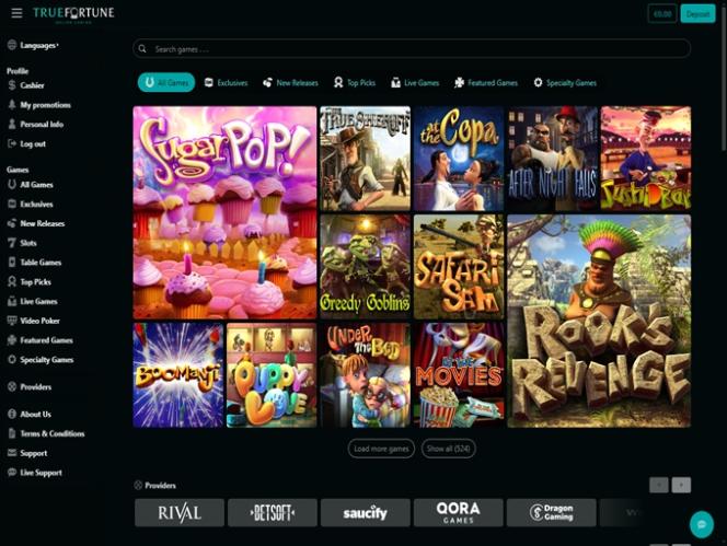 ट्रू फॉर्च्यून कैसीनो BetSoft, Genesis Gaming, Rival, Saucify, Radi8 Games, Fresh Deck Studios, Woohoo Games, Qora Games, Genii and Dragon Gaming द्वारा संचालित है और गेम एक वेब-आधारित प्लेटफ़ॉर्म के माध्यम से उपलब्ध कराए जाते हैं जो आपके पसंदीदा ब्राउज़र के माध्यम से लोड होता है। साइट अच्छी तरह से डिज़ाइन की गई है और नेविगेट करने में आसान है। मैं अपने स्मार्टफ़ोन पर भी खेल पाया, क्योंकि साइट में मोबाइल सपोर्ट पहले से ही मौजूद है।अन्य खेल