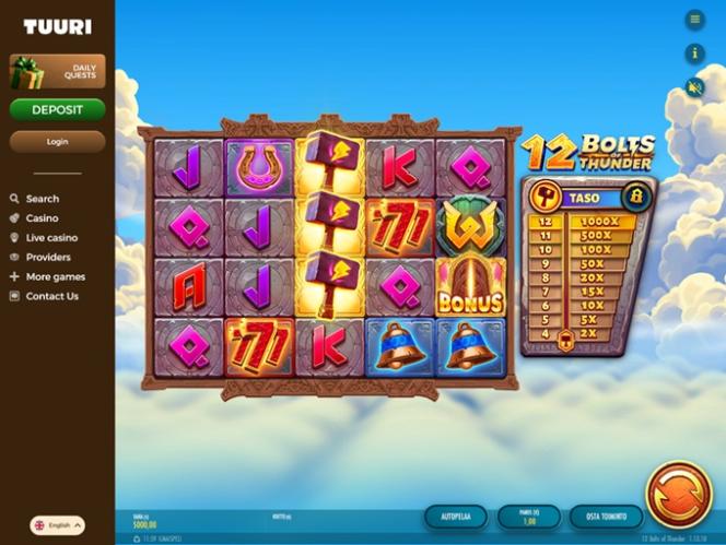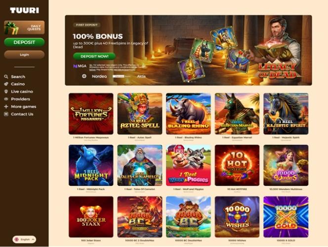 टुरीकासिनो एक आधुनिक ऑनलाइन कैसीनो है जिसने फ़िनिश खिलाड़ियों का खूब ध्यान आकर्षित किया है। यह सैकड़ों ऑनलाइन स्लॉट, लाइव डीलर, टेबल गेम और इंस्टेंट क्रैश गेम्स सहित खेलों का एक प्रभावशाली संग्रह प्रदान करता है। खिलाड़ियों को कई प्रमोशन का भी लाभ मिलेगा, जिनमें पुरस्कृत बोनस, विशेष वीआईपी पुरस्कार और दैनिक चुनौतियाँ शामिल हैं जिन्हें वे पूरा कर सकते हैं।