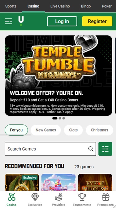 Unibet सैकड़ों कैसीनो गेम प्रदान करता है, जो Microgaming, Net Entertainment, Playtech, 1x2gaming, Barcrest, Big Time Gaming, ELK Studios, Evolution Gaming, lightningboxgames, Novomatic, Oryx, Play'n GO, playson, Quickspin, Relax Gaming, Thunderkick, Yggdrasil, Realistic Games, Betgames, Stakelogic, Pragmatic Play, Nolimit City, Felt Gaming, Red Tiger Gaming, IGT, Fantasma Games, Kalamba, Spin Games, Skywind, Triple Edge Studios, Northern Lights Gaming, Stormcraft Studios, Electric Elephant Games, Pocket Games Soft, Bulletproof Games, All41 Studios, Gluck Games, Gameburger Studios, Neon Valley Studios, SpinPlay Games, GONG Gaming, Blue Guru Games, On Air Entertainment, Buck Stakes Entertainment, Design Works Gaming, Games Global, Bally Technologies, bluberi, Blueprint Gaming, Greentube, Leander Games, NextGen, Push Gaming, WMS, Inspired Gaming, SG Interactive, Gamomat, Red7Mobile, Scientific Games, Reel Time Gaming, BF Games, Iron Dog Studio, Foxium, Just For The Win, Storm Gaming Technology, PearFiction Studios, Wild Streak Gaming, Slingshot Studios, Fortune Factory Studios, 4ThePlayer, AvatarUX, Gamevy, Crazy Tooth Studio, High 5 Games, ReelPlay, Alchemy Gaming, Rarestone Gaming, BB Games, Black Pudding Games, Snowborn Games, Boomerang Studios, Hacksaw Gaming, Max Win Gaming, Gold Coin Studios, Bang Bang Games, SilverBack Gaming, Peter And Sons, Eurostar Studios, Aurum Signature Studios, Lucksome Gaming, Area Vegas and Betradar द्वारा प्रदान किए जाते हैं। खेलों की इस विशाल सूची में स्लॉट, वीडियो पोकर, टेबल गेम, लॉटरी, बिंगो और कौशल गेम शामिल हैं।