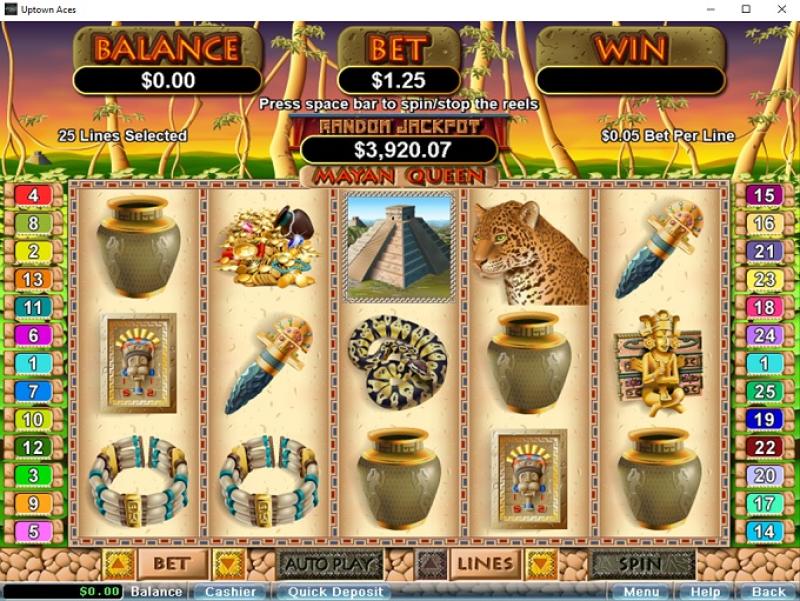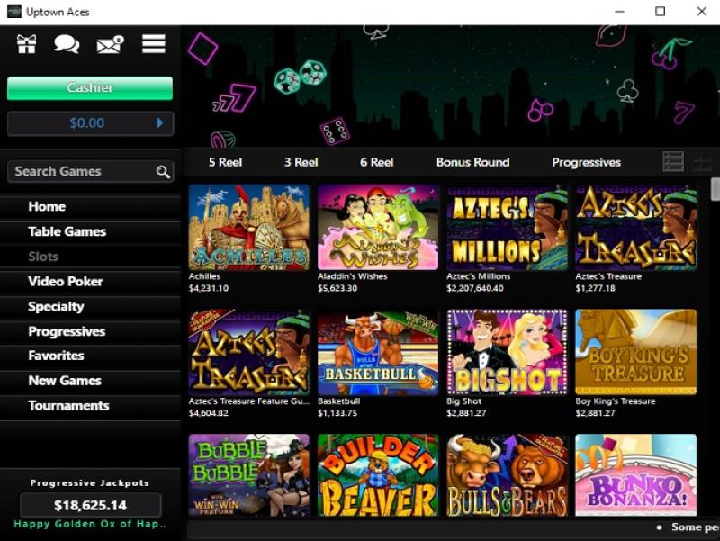 अपने सभी टेबल गेम्स के अलावा, Uptown Aces में स्लॉट गेम्स की एक विशाल लाइब्रेरी है, जिसमें कई 5-रील गेम्स के साथ-साथ पारंपरिक 3-रील स्लॉट भी शामिल हैं जो सिंगल फिक्स्ड पेलाइन ऑफर करते हैं। इन गेम्स के एक बड़े संग्रह में बड़े नकद पुरस्कारों वाले प्रोग्रेसिव जैकपॉट शामिल हैं।