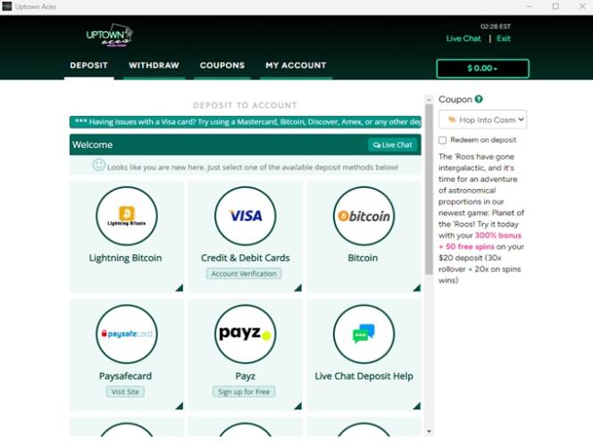 Uptown Aces Real Time Gaming द्वारा संचालित दो डेकमीडिया कैसीनो में से एक है, जो कैसीनो के तत्काल खेलने और डाउनलोड करने योग्य दोनों संस्करण प्रदान करता है।