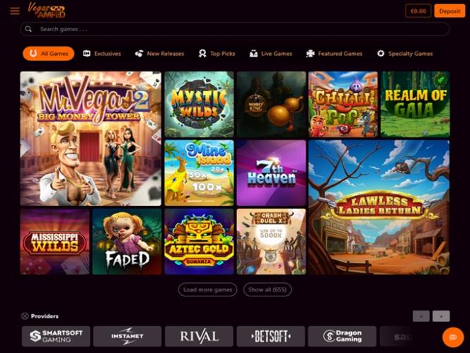 वेगास एम्पेड कैसीनो BetSoft, Genesis Gaming, Rival, Saucify, Vivo Gaming, Spinomenal, Felix Gaming, Fugaso, Radi8 Games, Fresh Deck Studios, Woohoo Games, Qora Games, SmartSoft Gaming, Tom Horn Gaming, Genii, Wager Gaming, Dragon Gaming and Dragoon Soft द्वारा संचालित है, और कैसीनो के गेम एक डाउनलोड करने योग्य सॉफ़्टवेयर के साथ-साथ एक वेब-आधारित इंस्टेंट प्ले प्लेटफ़ॉर्म के माध्यम से उपलब्ध कराए जाते हैं। कैसीनो मोबाइल प्ले को भी सपोर्ट करता है, जिससे आप कहीं भी, जहाँ भी डेटा सिग्नल उपलब्ध हो, खेल सकते हैं।अन्य खेल