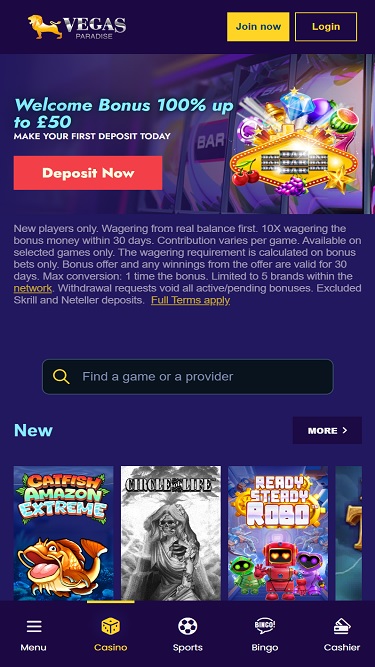 वेगास पैराडाइज़ कैसीनो एक ऑनलाइन सट्टेबाजी साइट है जिसकी स्थापना 2014 में हुई थी और इसका स्वामित्व और संचालन प्रोग्रेसप्ले लिमिटेड के पास है। इस कैसीनो में खेलों की एक विशाल लाइब्रेरी, तेज़ भुगतान समय और अच्छा प्रबंधन है, हालाँकि सामान्य से ज़्यादा निकासी बोनस कुछ खिलाड़ियों को पसंद नहीं आ सकता है।कैसीनो जानकारी