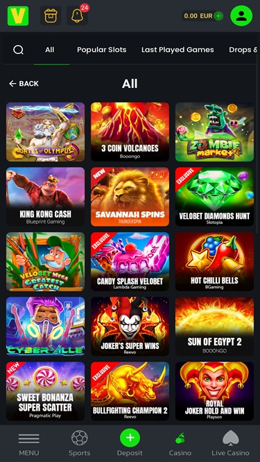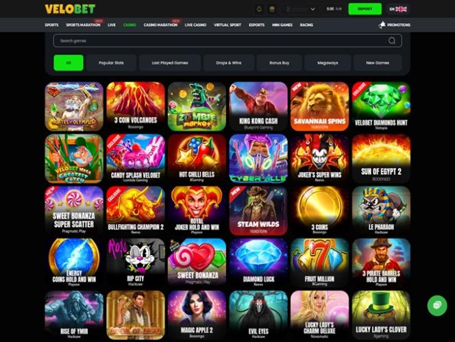 वेलोबेट की सभी सामग्री सुव्यवस्थित और निम्नलिखित श्रेणियों में व्यवस्थित है: खेल, मैराथन, लाइव, कैसीनो, लाइव कैसीनो, वर्चुअल खेल, ई-स्पोर्ट्स, मिनी गेम्स और रेसिंग। यहाँ से खिलाड़ी अपना पसंदीदा खेल चुन सकते हैं और इस ऑनलाइन कैसीनो द्वारा प्रदान किए जाने वाले मनोरंजन का आनंद ले सकते हैं।