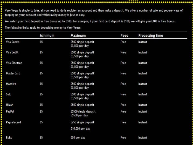 वेरी वेगास मोबाइल कैसीनो की बैंकिंग प्रणाली थोड़ी सीमित है, लेकिन फिर भी एक मोबाइल बेटिंग साइट के लिए ठीक-ठाक है। वीज़ा, मास्टरकार्ड, पेसेफकार्ड, सोलो, पेपाल और मास्ट्रो के माध्यम से जमा और निकासी स्वीकार की जाती है, जबकि बैंक हस्तांतरण के माध्यम से भी निकासी की जा सकती है। पेपाल से प्रतिदिन निकासी की सीमा £1,000 है, जबकि क्रेडिट और डेबिट कार्ड से प्रतिदिन पाँच लेनदेन किए जा सकते हैं, प्रत्येक लेनदेन की सीमा £20,000 है। निकासी की प्रक्रिया में लगभग 3-5 दिन लगते हैं।Very Vegas Mobile Casino पर बैंकिंग विकल्प