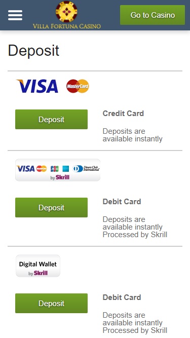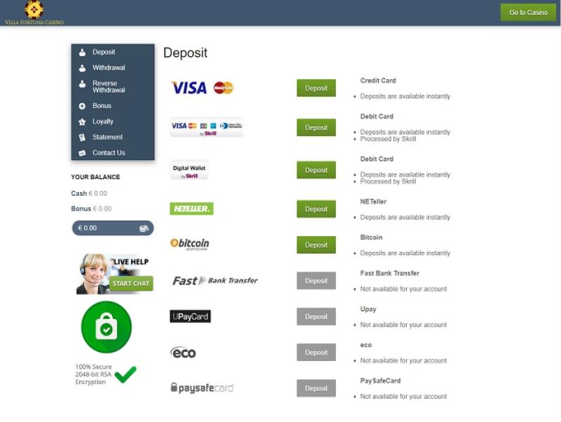 विला फ़ोर्टुना कैसीनो में बैंकिंग प्रणाली काफी अच्छी है, क्योंकि साइट पर अमेरिकन एक्सप्रेस, गिरोपे, आईडील, मास्टरकार्ड, नेटेलर, पेसेफकार्ड, स्क्रिल, सोफोर्ट, वीज़ा, वायर ट्रांसफ़र और बैंक वायर के ज़रिए जमा और निकासी की सुविधा उपलब्ध है। भुगतान का समय अलग-अलग तरीकों से अलग-अलग होता है।