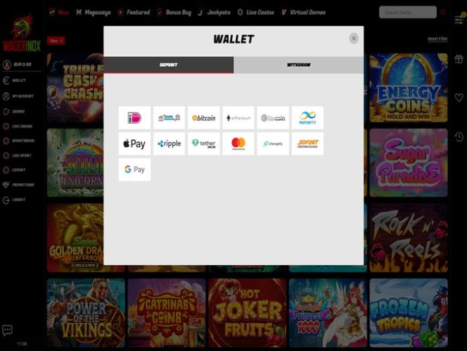 वेगेरिनॉक्स कई लोकप्रिय बैंकिंग विकल्प प्रदान करता है, जिनमें व्यापक रूप से उपयोग किए जाने वाले ई-वॉलेट और अन्य ऑनलाइन भुगतान प्रणालियाँ शामिल हैं। जुआरी क्रेडिट और डेबिट कार्ड, बैंक वायर ट्रांसफ़र और अन्य प्रकार के धन हस्तांतरण विकल्पों में से चुन सकते हैं। ध्यान दें कि उपलब्ध विकल्प देश-आधारित हैं, इसलिए आपको कैसीनो के कैशियर से यह सुनिश्चित करने के लिए संपर्क करना चाहिए कि आपके क्षेत्र में आपकी पसंदीदा विकल्प उपलब्ध है या नहीं।