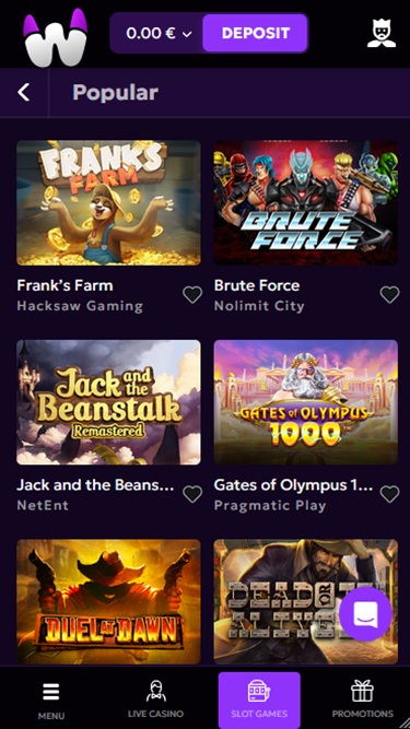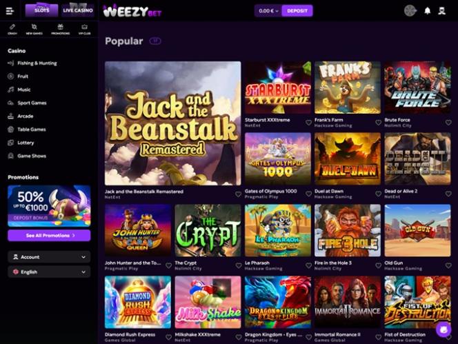WeezyBet.com एक उपयोगकर्ता-अनुकूल ऑनलाइन कैसीनो है जिसे पर्सनल कंप्यूटर और मोबाइल दोनों के ज़रिए एक्सेस किया जा सकता है। इसलिए, चाहे आप पीसी पर जुआ खेलना पसंद करते हों या चलते-फिरते कैसीनो गेम खेलना , आप सभी उपलब्ध प्लेटफ़ॉर्म पर तेज़ लोडिंग समय और बेहतरीन इंटरफ़ेस का लाभ उठा सकते हैं।