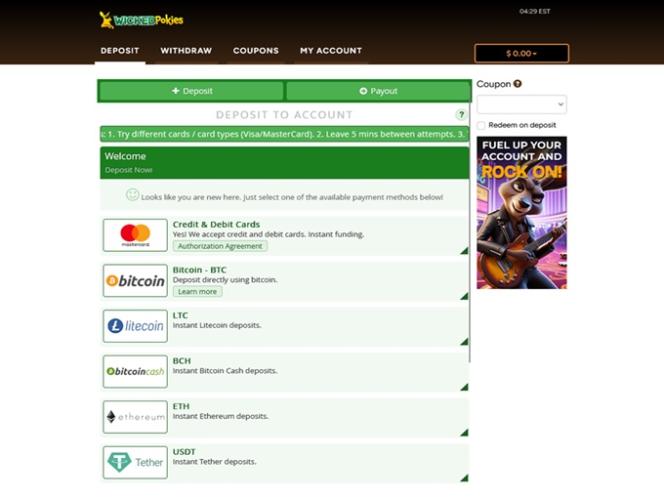 विकेड पोकीज़ विश्वसनीय बैंकिंग विकल्प प्रदान करता है। खिलाड़ी पारंपरिक और आधुनिक, दोनों तरीकों में से चुन सकते हैं। कैशियर ऑस्ट्रेलियाई डॉलर, बिटकॉइन, एथेरियम, लाइटकॉइन, यूएसडी कॉइन और टीथर में लेनदेन का समर्थन करता है। कैसीनो डेबिट और क्रेडिट कार्ड प्रदान करता है, जबकि क्रिप्टो उत्साही लोकप्रिय डिजिटल सिक्कों का उपयोग करके जमा और निकासी कर सकते हैं।