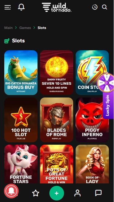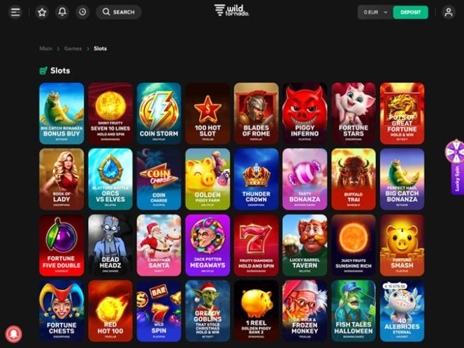 वाइल्ड टॉर्नेडो में स्लॉट्स का एक अच्छा संग्रह उपलब्ध है। इस कैसीनो में नेट एंट, एनवाईएक्स, सॉफ्टस्विस, प्रैगमैटिक प्ले, एंडोर्फिना और अन्य डेवलपर्स के गेम उपलब्ध हैं। इसके अलावा, कई प्रोग्रेसिव जैकपॉट भी उपलब्ध हैं, जो रीलों के एक ही स्पिन पर जीते जा सकने वाले बड़े नकद पुरस्कार प्रदान करते हैं। मोबाइल स्लॉट खेलने की भी सुविधा उपलब्ध है।