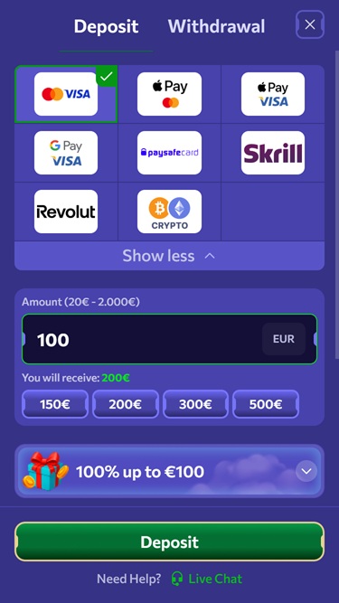 न्यूनतम जमा राशि खिलाड़ी के निवास देश के आधार पर अलग-अलग होगी, जबकि अधिकतम राशि भुगतान विधि के चयन पर निर्भर करेगी।