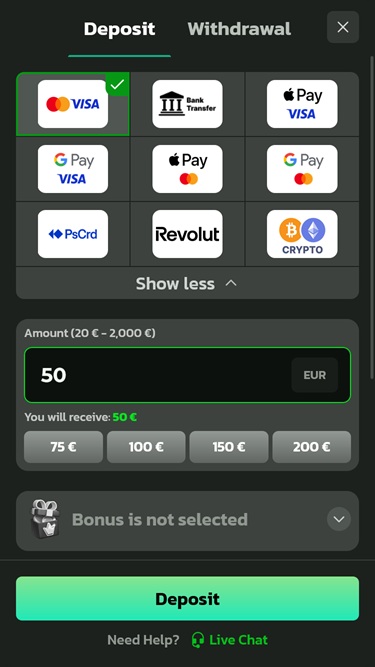 जमा और निकासी करने के लिए एप्पल पे, गूगल पे, रिवोल्यूट और अन्य ऑनलाइन बैंकिंग सेवाओं के साथ-साथ बैंक वायर ट्रांसफर, पेमेंट कार्ड और अन्य विकल्प उपलब्ध हैं।