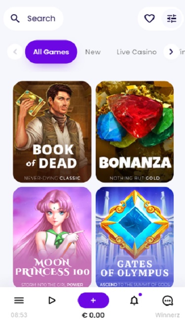 कैसीनो एक रंगीन और सुंदर गेमिंग इंटरफ़ेस का उपयोग कर रहा है, जिसे सफेद पृष्ठभूमि पर ग्लैमरस, चमकदार, भविष्यवादी विवरणों के साथ नीऑन बैंगनी और फ़िरोज़ा रंगों में डिज़ाइन किया गया है, जिससे कैसीनो प्लेटफ़ॉर्म बेहद आधुनिक और आकर्षक दिखता है।