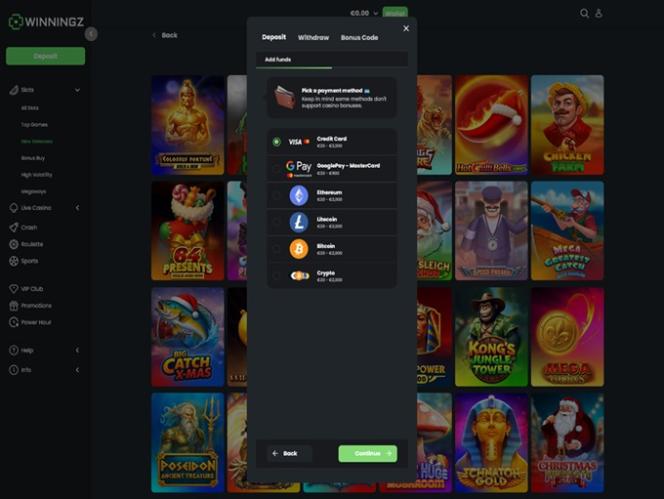 विनिंगज़ कैसीनो विभिन्न भुगतान विधियां प्रदान करता है जैसे बैंक वायर ट्रांसफर, गूगल पे, वीज़ा और मास्टरकार्ड , साथ ही बिटकॉइन, बिटकॉइन कैश, कार्डानो, डॉगकॉइन, एथेरियम, लाइटकॉइन, रिपल, सोलाना, टीथर, ट्रॉन और यूएसडी कॉइन जैसे क्रिप्टो विकल्प भी प्रदान करता है।