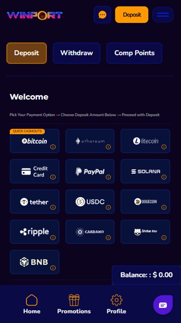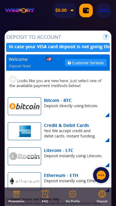 विनपोर्ट कैसीनो एक क्रिप्टोकरेंसी अनुकूल ऑनलाइन कैसीनो है, जो कुराकाओ के कानूनों के तहत लाइसेंस प्राप्त है और संयुक्त राज्य अमेरिका, कनाडा, न्यूजीलैंड, ऑस्ट्रेलिया और यूके में स्थित पंटर्स के लिए उन्मुख है।