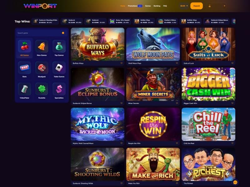 विनपोर्ट, राइवल, न्यूक्लियस गेमिंग और ड्रैगन गेमिंग के साथ सहयोग करता है और यह विभिन्न लोकप्रिय श्रेणियों में ऑनलाइन कैसीनो गेम प्रदान करता है जैसे: