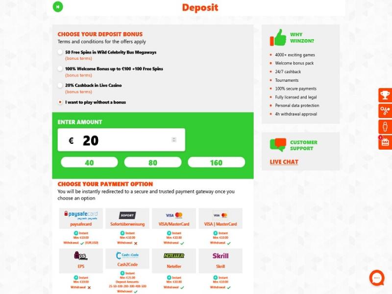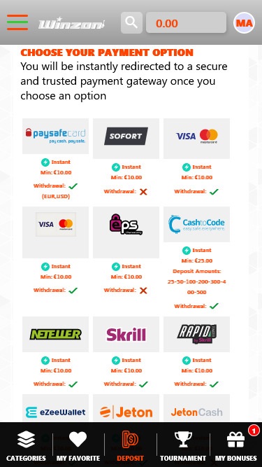 बैंकिंग विकल्पों की बात करें तो, विंज़ोन कैसीनो में भुगतान के कुछ बेहतरीन तरीके उपलब्ध हैं। खिलाड़ी वीज़ा, मास्टरकार्ड, नेटेलर और स्क्रिल जैसे लोकप्रिय विकल्पों में से चुन सकते हैं। क्रिप्टोकरेंसी से भुगतान का विकल्प भी उपलब्ध है, जो पिछले कुछ समय से एक लोकप्रिय विकल्प रहा है।