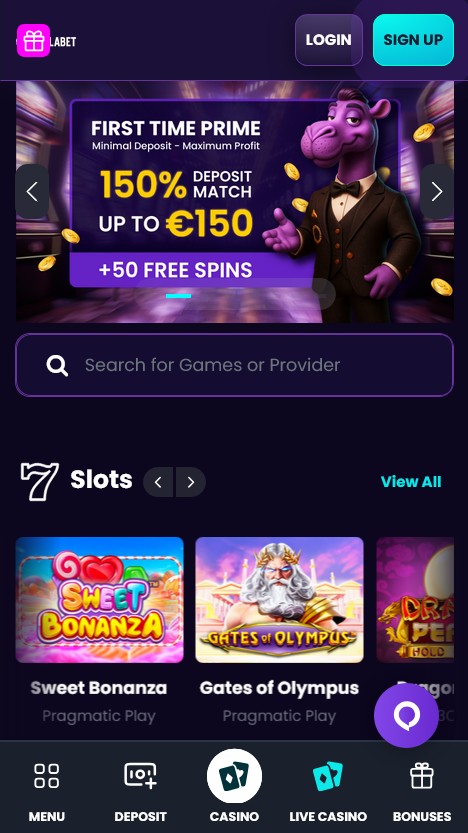 कैसीनो की वेबसाइट खोलते ही आपका स्वागत एक आधुनिक, बैंगनी रंग की थीम वाले लेआउट से होता है। मेनू सुव्यवस्थित है और कैसीनो के सभी महत्वपूर्ण अनुभागों तक आसान पहुंच प्रदान करता है।