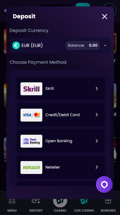 मेनू के शीर्ष पर मेरे बोनस, बोनस और टूर्नामेंट के लिए जगह आरक्षित है, उसके बाद कैसीनो, लाइव कैसीनो और खिलाड़ियों के लिए मेनू हैं, जबकि लाइव सपोर्ट और डिपॉजिट बटन सबसे नीचे स्थित हैं।