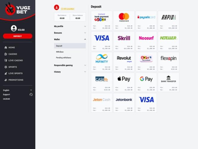 जो खिलाड़ी क्रिप्टोकरेंसी को अपनी प्राथमिक बैंकिंग पद्धति के रूप में इस्तेमाल करना पसंद करते हैं, उन्हें यह जानकर निराशा होगी कि ऐसा कोई विकल्प उपलब्ध नहीं है। दूसरी ओर, अगर आप वीज़ा, मास्टरकार्ड, नेटेलर, स्क्रिल, पेसेफकार्ड, नियोसर्फ, जेटनकैश जैसे लोकप्रिय बैंकिंग विकल्पों के ज़रिए पैसे निकालना और जमा करना चाहते हैं, तो आपको यह जानकर खुशी होगी कि वे बिना किसी समस्या के ऐसा कर पाएँगे।