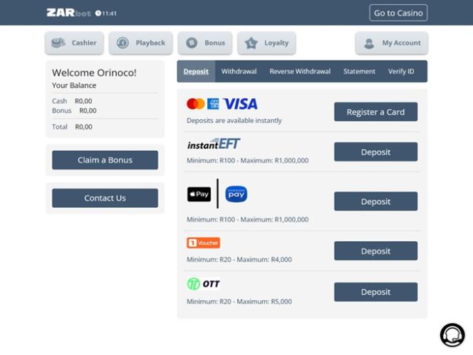 - सभी नकद निकासी उसी भुगतान विकल्प से की जाएगी जिसका उपयोग जमा करने के लिए किया गया था, तथा ध्यान रखें कि कैसीनो केवल दक्षिण अफ्रीकी बैंकों और बैंक खातों में ही भुगतान कर सकता है।