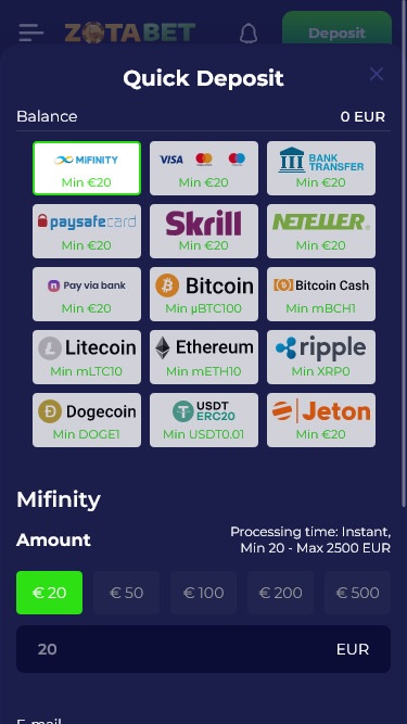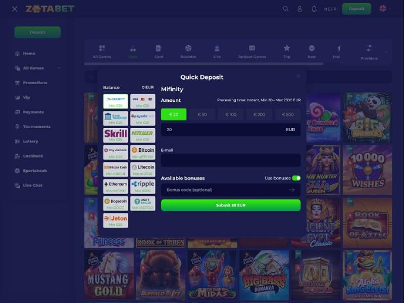 ज़ोटाबेट कैसीनो में क्रिप्टोकरेंसी भुगतान कई उपलब्ध बैंकिंग विकल्पों में से एक है। कैशियर कई प्रसिद्ध भुगतान विधियों का समर्थन करता है जिससे जमा और निकासी आसान और परेशानी मुक्त हो जाती है।