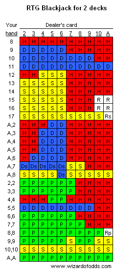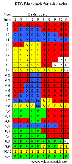 निम्नलिखित तालिकाएं दो और 4-8 डेक के लिए रियल टाइम गेमिंग कैसीनो के लिए बुनियादी रणनीति प्रदर्शित करती हैं।
