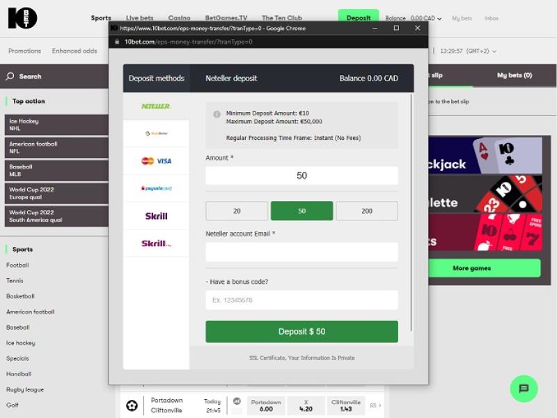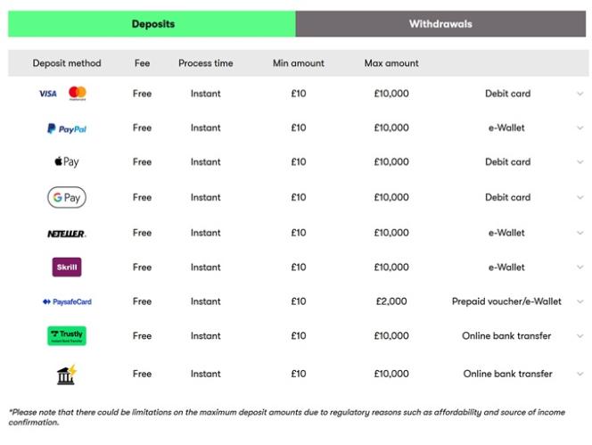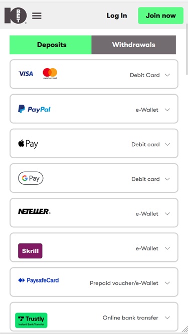 लाइसेंसिंग पर विचार करने के अलावा, हम यह भी अनुशंसा करते हैं कि आप ध्यान से विचार करें कि जिस खेल सट्टेबाजी साइट में आप रुचि रखते हैं, वहां कौन सी भुगतान विधियां उपलब्ध हैं। 10bet अपने खिलाड़ियों को जमा और निकासी के लिए बैंकिंग विकल्पों की एक विस्तृत श्रृंखला प्रदान करता है, जिसमें क्रेडिट कार्ड, इलेक्ट्रॉनिक वॉलेट, बैंक ट्रांसफर, प्रीपेड कार्ड और क्रिप्टोकरेंसी शामिल हैं।