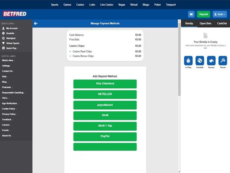 जमा विधियों में मेस्ट्रो, वीज़ा और वीज़ा इलेक्ट्रॉन, मास्टरकार्ड, नेटेलर, पेपैल, स्क्रिल, पेसेफ, बैंक ट्रांसफर, बेटफ्रेड शॉप्स शामिल हैं।