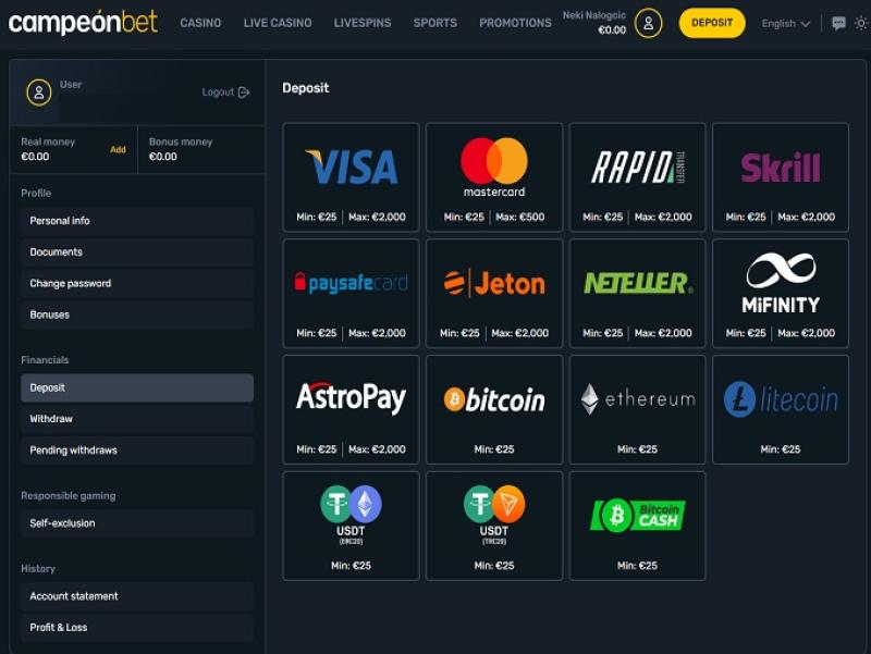 जमा विधियाँ: वीज़ा, सेपा, नेटेलर, स्क्रिल, जेटन वॉलेट, पे सेफ कार्ड, इको पेज़, आई - डील, गिरो पे, मच बेटर, नियो सर्फ, सेफ चार्ज, ई - प्रो, ई - वाउचर, एमआई फिनिटी, रैपिड ट्रांसफर, बिटकॉइन कैश, बिटकॉइन, एथेरियम और लाइटकॉइन।