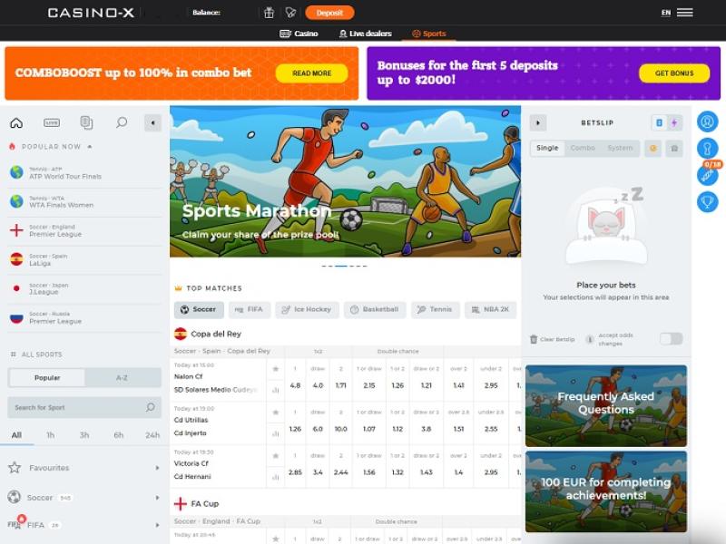 सब कुछ देखते हुए, कैसीनो-एक्स एक विशाल स्पोर्ट्स बेटिंग साइट है जो अपने सट्टेबाजों को दांव लगाने के लिए ढेरों स्पोर्ट्स इवेंट्स देने से नहीं हिचकिचाती। यह स्पोर्ट्सबुक दर्जनों स्पोर्ट्स, वर्चुअल स्पोर्ट्स, ईस्पोर्ट्स और रेसिंग इवेंट्स पर दांव लगाने की सुविधा प्रदान करता है, और साथ ही लाइव बेटिंग की सुविधा भी देता है।